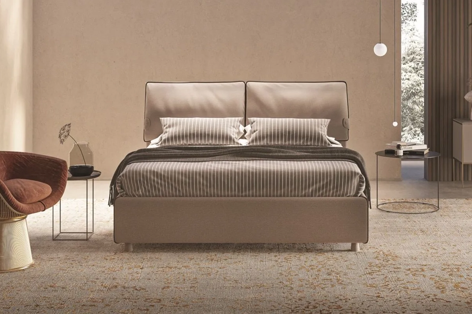 Scopri il letto Beatrice, un elegante modello imbottito moderno caratterizzato da una testiera personalizzabile in quattro varianti e finiture sartoriali esclusive. Disponibile con box contenitore, unisce raffinatezza artigianale e praticità per una camera da letto unica.